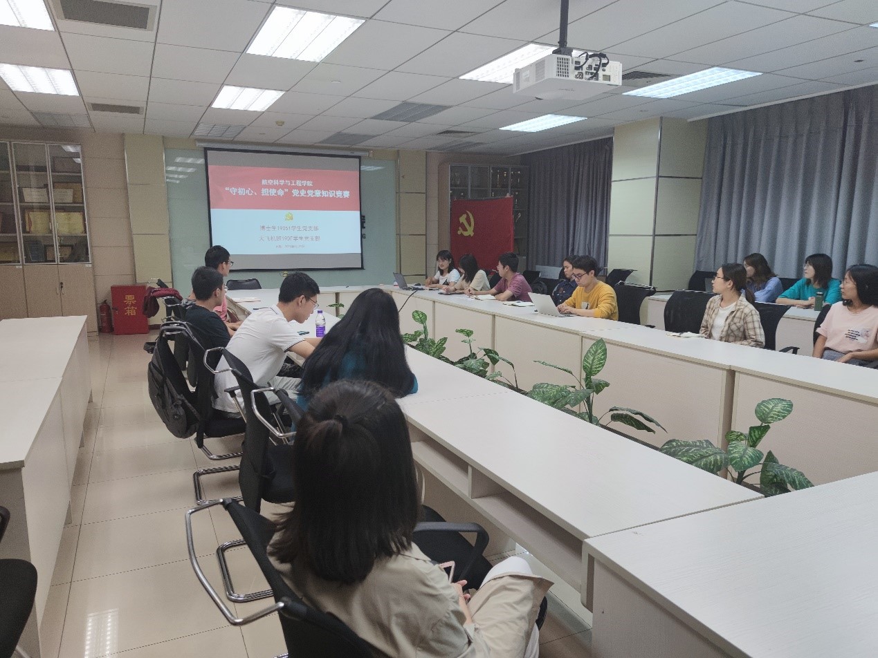 2020年9月27日晚18:30,博士生19051员工党支部与大飞机班19DF员工党支部在新主楼C708开展“守初心、担使命”党史党章知识竞赛总结大会。首先汤艳霞同志强调了学习党史党章的重要性,学习党史、国史,是坚持和发展中国特色社会主义、把党和国家各项事业继续推向前进的必修课。然后总结了知识竞赛的参与情况与得分分布情况。最后汤艳霞同志总结提出,历史是最好的教科书,作为青年员工党员也要注重党史党章的学习,从中发现真理、明确方向、坚定道路、汲取力量,去书写新的历史、创造新的辉煌。