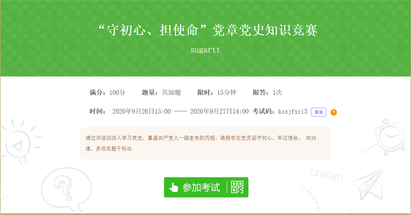 活动开展前期,博士生19051员工党支部与大飞机班19DF员工党支部的支委进行充分调研,选取题库,于2020年9月26日15:00线上发布试题,涵盖党史、新中国史、改革开放史、社会主义发展史和党章知识等内容。
