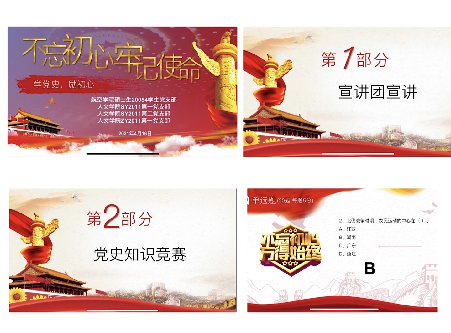 4月16日晚,北航yl6809永利硕士生20054员工党支部、人文社会科学学院SY2011第一党支部、SY2011第二党支部、ZY2011党支部联合开展了“学党史、励初心”系列主题学习日活动。此次学习日活动主要分为宣讲和知识竞赛两个部分:来自北航研究生宣讲团的武佳奇讲师和北航民法典宣讲团的齐笑讲师分别做主题报告,在集体听取了宣讲报告后,支部成员开展了激烈且具趣味性的党史知识竞赛。活动由yl6809永利硕士生20054员工党支部书记强鑫主持。