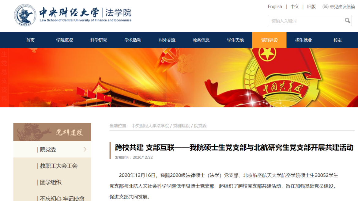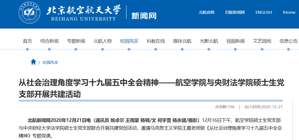2020年12月16日下午,两支部员工党员代表在yl6809永利集团开展了以“解读十九届五中全会精神”为主题的专题党课活动,邀请了yl6809永利集团马克思主义学院王晨老师担任主讲人。王老师通过多重维度,运用多种方法为各个支部、不同专业同学提供了理解会议精神的全新视角,促进了思维交汇。在课程讨论的过程中,两校同学加强了支部党员交流,增进了共建互联友谊。该活动分别在北航新闻网和央财法学院官网上进行了报道。