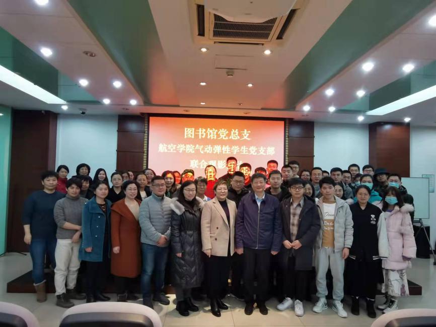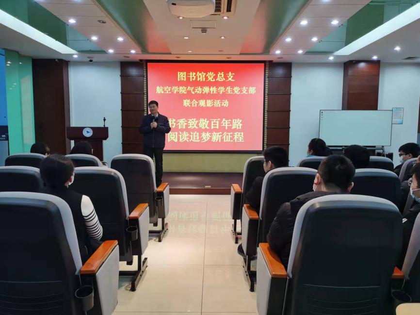 在观影前,北航图书馆党总支书记、馆长杨超教授发表了讲话。杨超教授首先高度评价了近期图书馆党总支第二党支部与气动弹性员工党支部联合开展的一系列共建活动。前期活动中,两支部党员举办座谈会展开谈论,设计调查问卷,调查并分析了北航员工阅读习惯、对图书馆的了解程度等,得出了一系列有助于提高图书馆服务质量的结论;针对调查中暴露出的问题,开展了主题辩论活动,将实践与思辨结合,激发了同志们的阅读兴趣;此外两支部共同发起的21天读书打卡活动,也受到广泛关注,目前已有众多师生参与,累计打卡次数已有一千一百余次。
