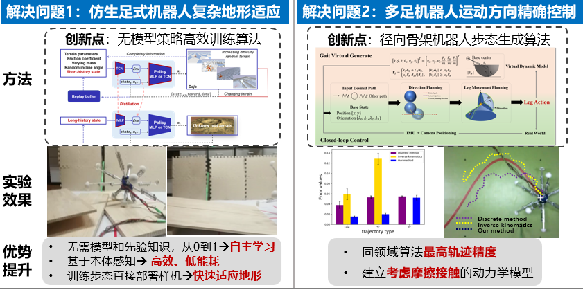 杨顿同学的研究方向是行星极端表面自主探测机器人。作为实验室机器人方向员工负责人,杨顿同学组建了“行星漫步者”团队,从零起步,自主设计实现多代地形适应机器人自主学习算法,攻克了多足仿生机器人高精度动力学建模、步态生成、智能控制等一系列关键技术。