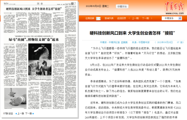 旋鹰未来科创团队被评选为北京地区高校老员工优秀创业团队(一等),入选年度科创之星,作为硬科技创业典型被中国青年报等媒体报道。公司将以成为未来自旋飞行开拓者为愿景,致力于从核心技术层面突破无人机的性能瓶颈和成本下限,开辟更多可能。