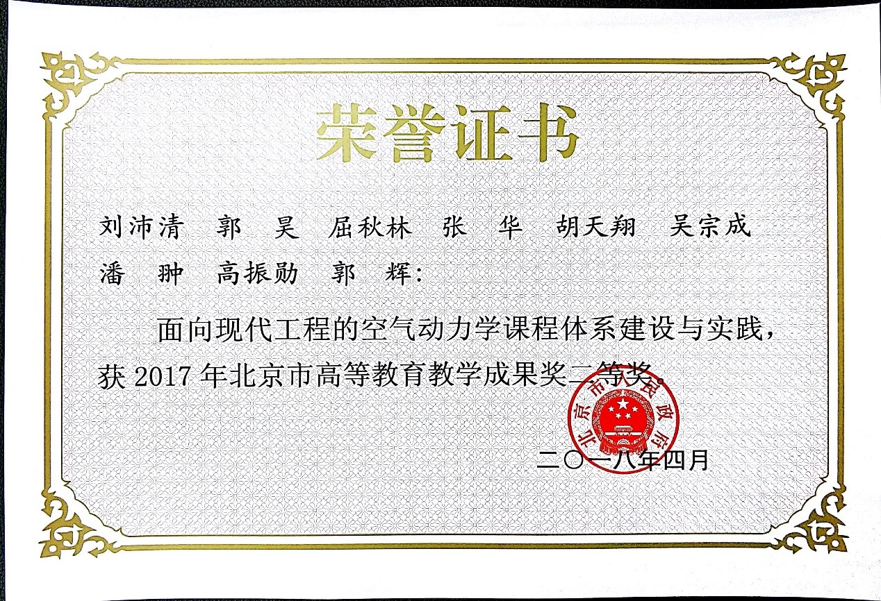 2000年获“全国100篇优秀博士论文”称号,2003年获全国**系统百名优秀博士、硕士先进工作者称号,2005年获国家教学成果二等奖(排名第4),2009年获北京市优秀教师,2009年获北京市教学成果一等奖。2011年获北京市教学名师。2014年刘沛清负责的“先进飞行器高级人才联合培养基地”获全国示范性全日制工程硕士专业学位研究生联合培养实践基地称号。2018年“面向现代工程的空气动力学课程体系建设与实践”获得北京市教学成果二等奖(排名第一)。承担教学任务:博士生课程“近代流体力学”;硕士生课程“湍流模型及其应用”和“大型客机总体概论”;本科生课程“空气动力学”和“现代大学概论”。