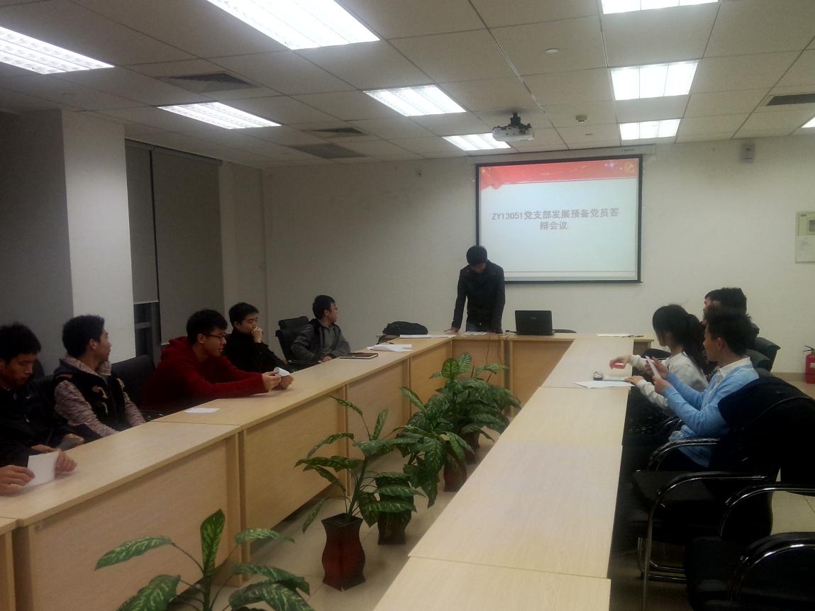 2014年11月25日,ZY13051党支部在新主楼C706举行本学期积极分子转预备党员答辩会议,参加本次会议的有,正式党员12名,参加答辩的积极分子4名。