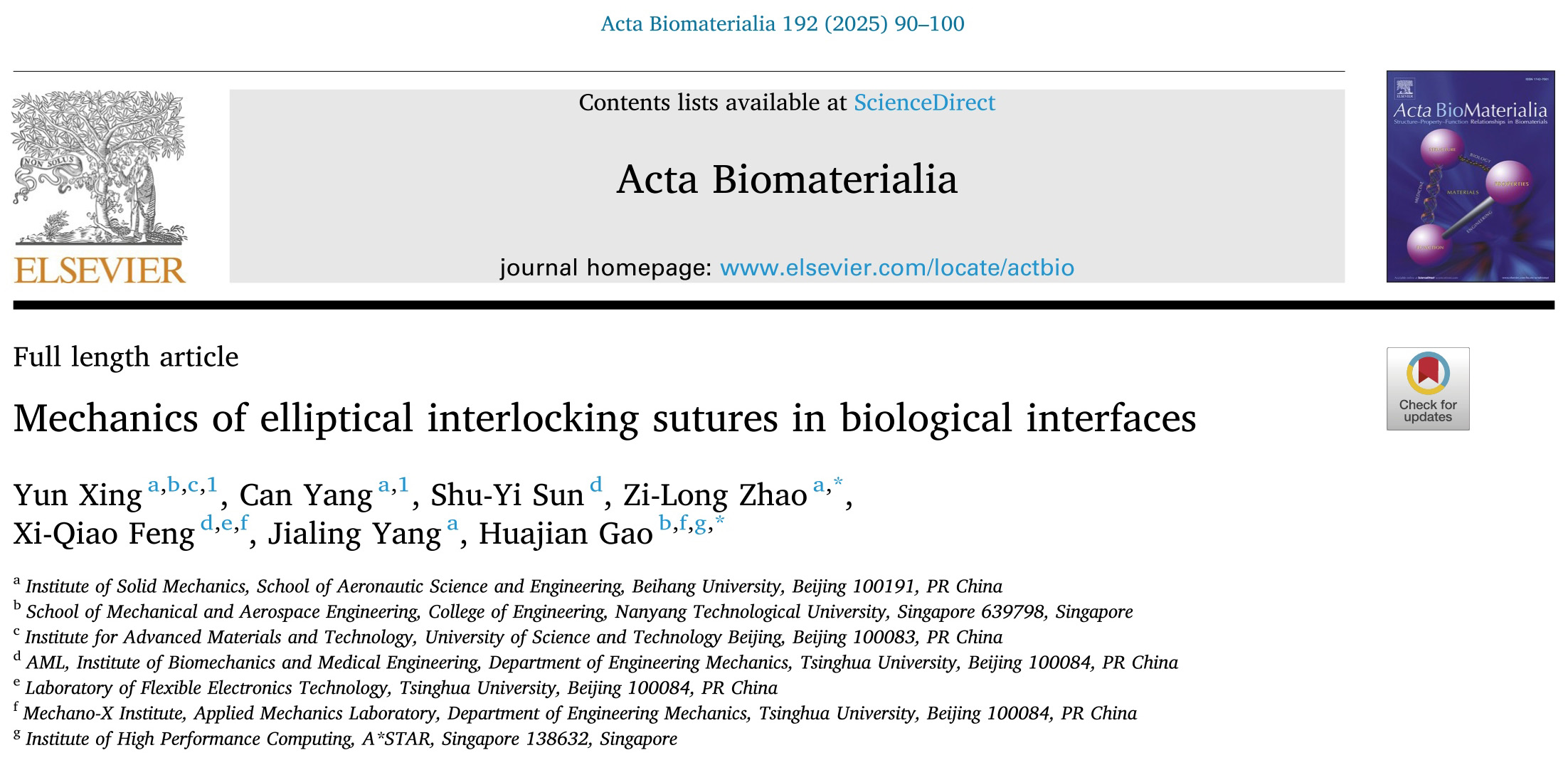 近日,公司赵子龙教授、杨嘉陵教授及其合作者在生物材料学顶级期刊《Acta Biomaterialia》发表论文《Mechanics of elliptical interlocking sutures in biological interfaces》。他们针对生物互锁界面开展研究,将甲虫翅鞘的椭圆型骨缝结构作为研究对象,建立了可以精确预测结构拉拔与失效行为的力学模型,揭示了此类结构的强韧化与优化机理。 经过长期的演化,许多生物结构进化出了复杂而精巧的界面形貌。这些结构具有优...