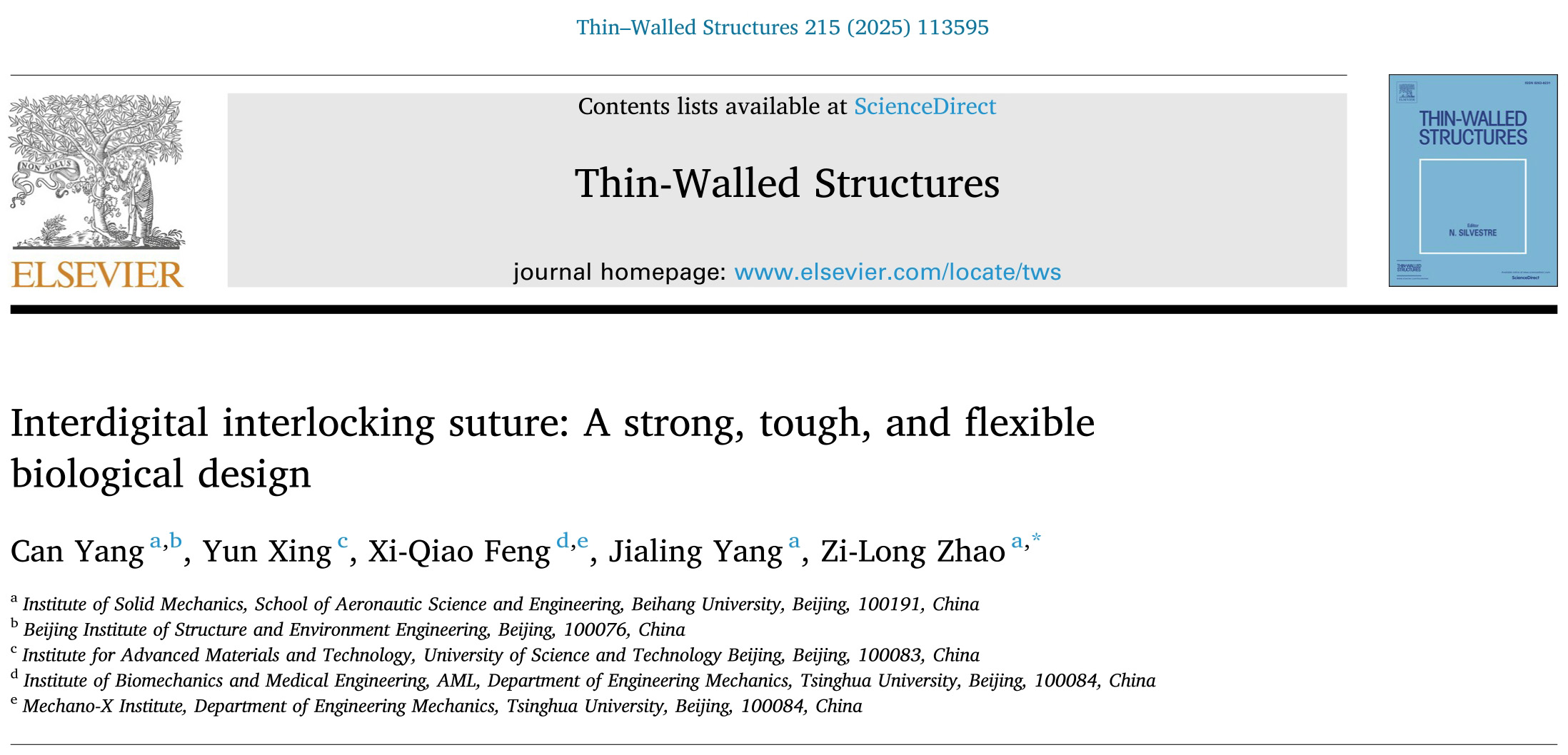 近日,公司赵子龙教授、杨嘉陵教授及其合作者在工程技术顶级期刊《Thin-Walled Structures》发表论文《Interdigital interlocking suture: A strong, tough, and flexible biological design》。他们以叉指型缝线结构为研究对象,建立了其变形与失效行为的力学分析模型,揭示了此类结构的形貌力学机理。 生物结构的界面形貌往往复杂而精巧,兼顾性质与功能。叉指型互锁结构不仅...